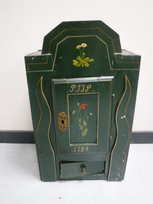 A hand painted antique oak wall cabinet