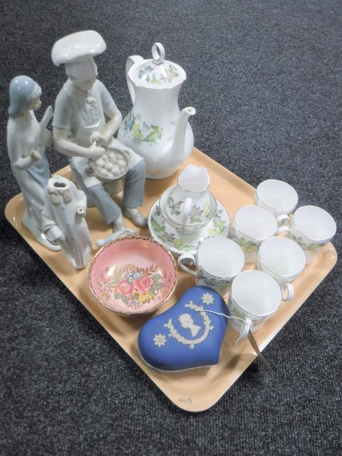 A tray of Spanish figures, Ridgway part tea set, Maling bowl, Jasperware silver jubilee bowl