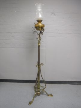 A Victorian brass rise and fall standard oil lamp