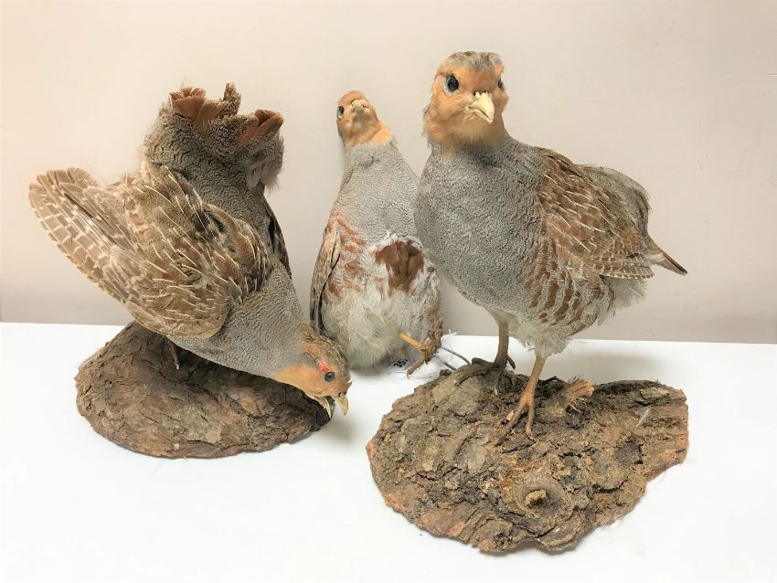 Three taxidermy partridges, two mounted on naturalistic wooden bases, the third unmounted