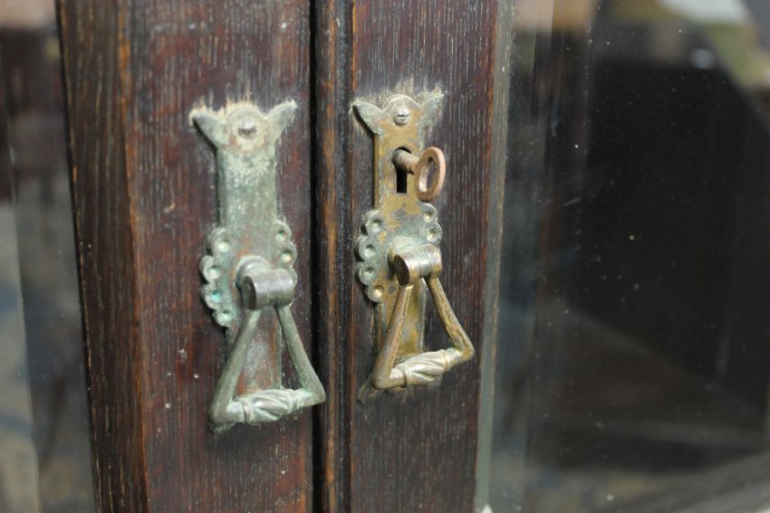 60cm deep and 166cm high. No signs of worm. One small piece of moulding between the doors has come loose but would re-glue very easily. Handles and locks are original. Metal work corroded somewhat. Drawers perhaps a little stiff. Several keys present. Two of the locks on the drawer are seized and will not operate. Generally in very good condition.