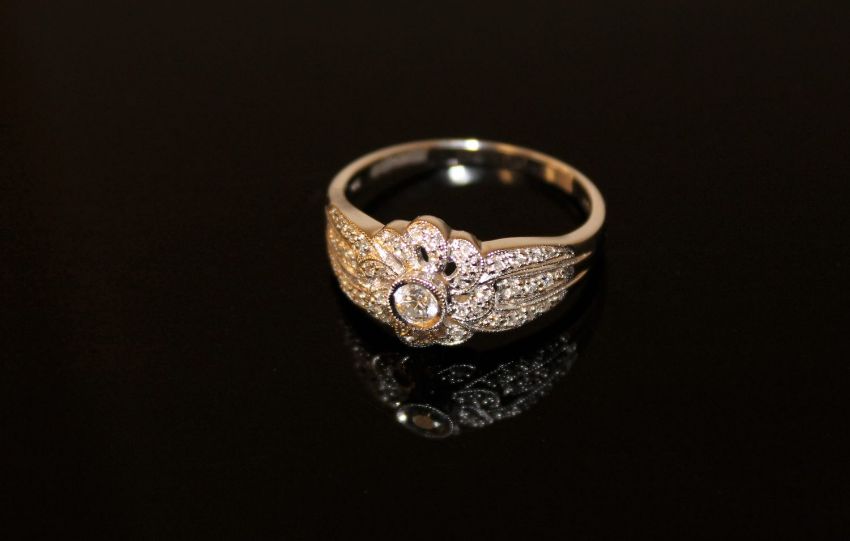 The ring is in good condition. It is stamped '750' for 18ct gold. The principal brilliant cut stone weighs approximately 0.1 carat. It is of approximately SI1/SI2 clarity and I/J colour. The other smaller stones are of comparable quality. The total diamond weight is estimated at 0.3 carat. The ring weighs 5.3g.