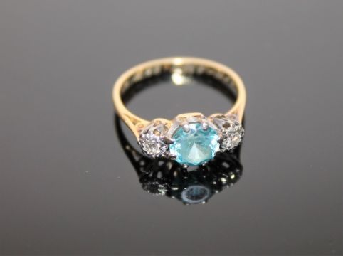 An 18ct gold blue zircon and diamond three stone ring, size L.