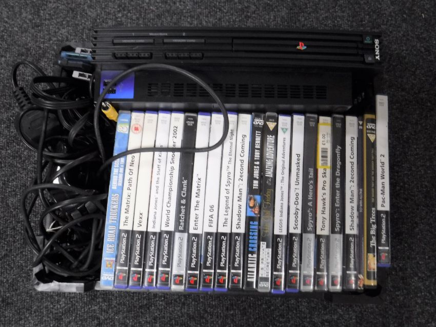 A box of Sony Playstation 2 and controllers, games etc