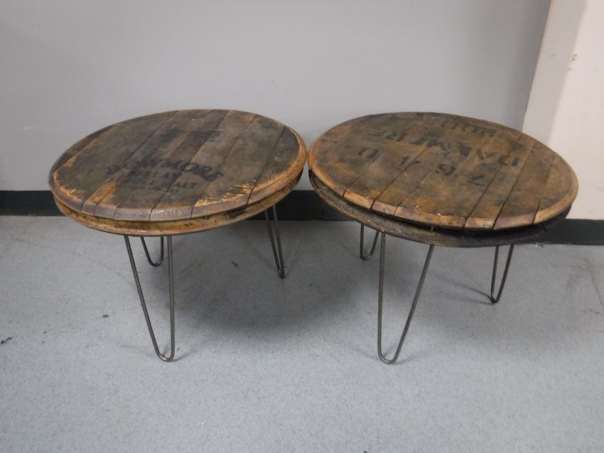Two oak whiskey barrel lid coffee tables bearing Bowmore and Danmore advertising