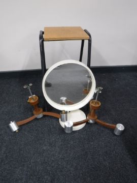 A pair of 1970's teak three way light fitting, together with a dressing table mirror and a stool