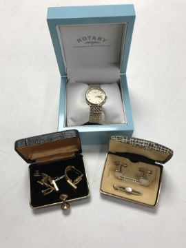 A boxed Rotary wristwatch together with assorted cufflinks and a Bakelite cased magnetic marching compass
