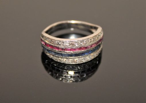 A diamond, sapphire and ruby half eternity ring, two rows of baguette-cut rubies and sapphires within borders of old-cut diamonds, size N