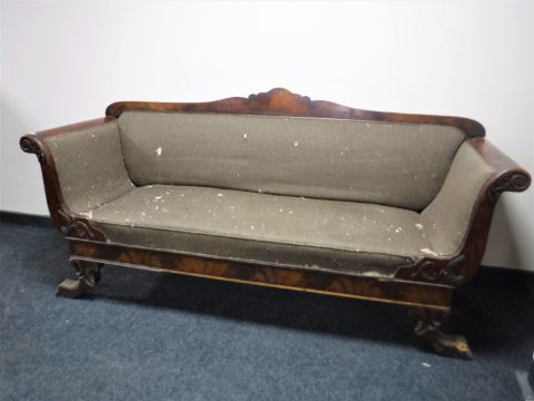 A Victorian mahogany scroll arm settee on paw feet