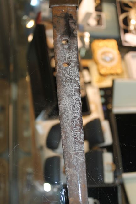 Slight wobble in the hilt. Blade quite clean. Scabbard in good order. See images of signature on tang. Chalk was added to highlight the inscription.