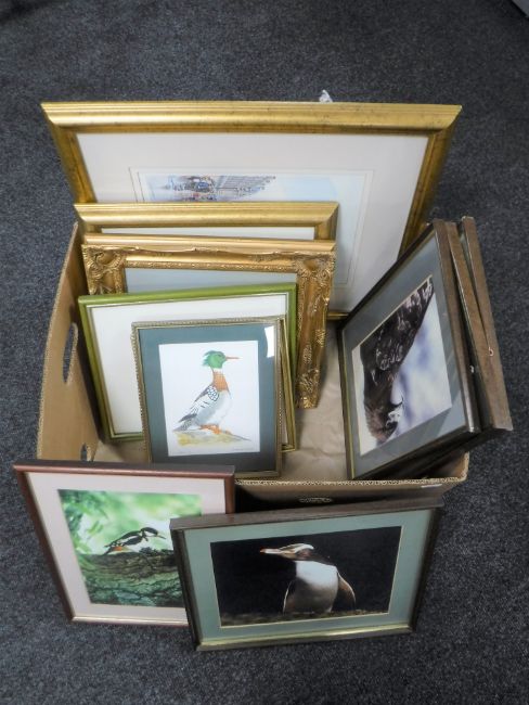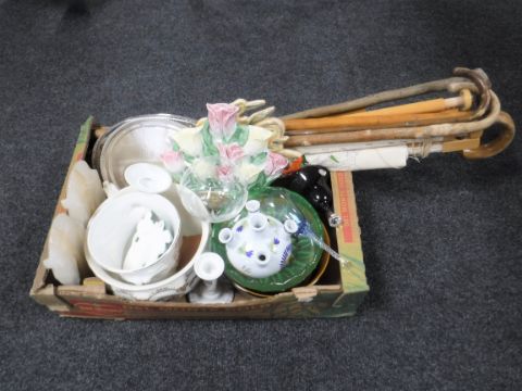 Two boxes of pictures, 20th century china and glass ware, walking sticks etc