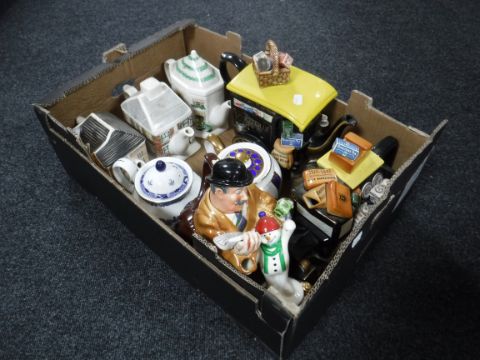 Two boxes of Ringtons teapots, Laurel and Hardy figures etc