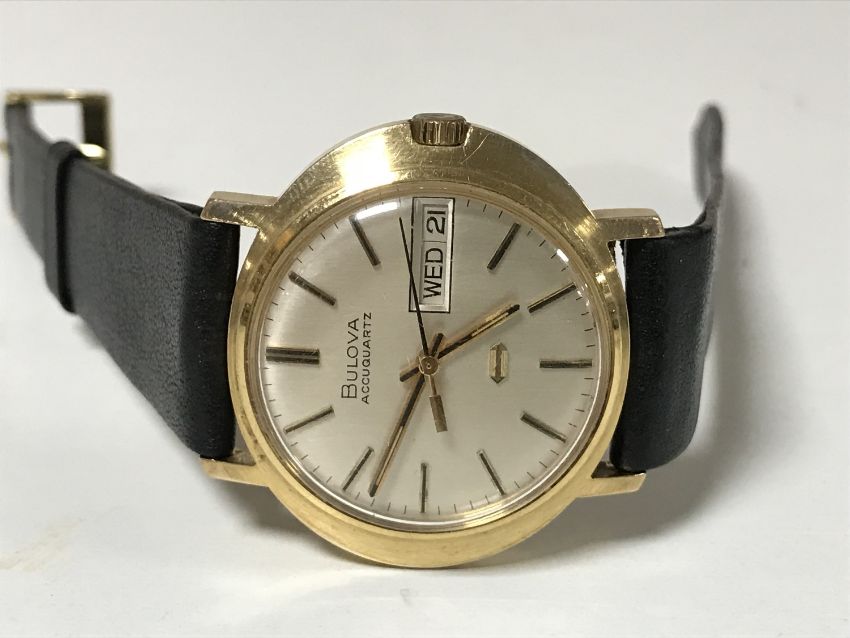 A scarce 9ct gold Bulova Accuquartz wristwatch, only made for a few years