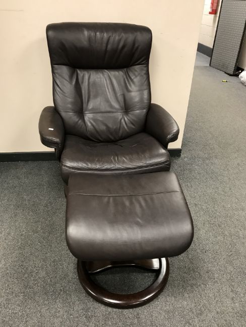 A brown leather relaxer chair with footstool retailed by John Lewis
