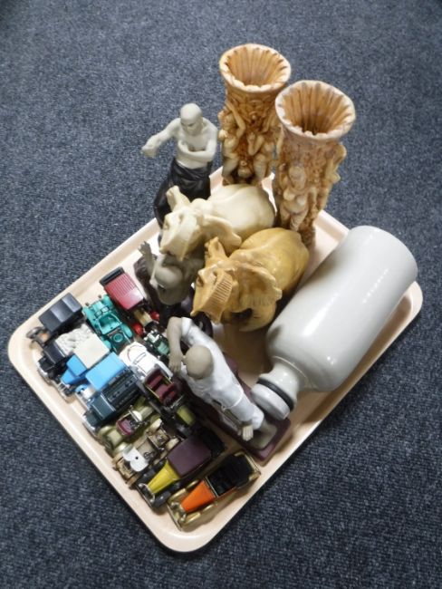 A tray containing two resin elephants together with a pair of resin vases, three oriental pottery warriors, stoneware bottle, die cast vehicles, ship's decanter with stopper