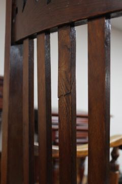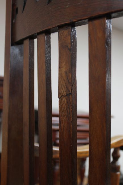 One chair with split forming in central rail. Upholstery somewhat tired. Otherwise in good order.