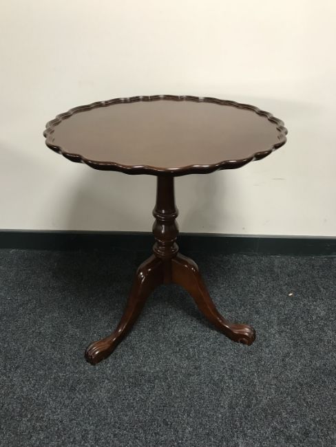 A mahogany pie crust edge tilt topped table on three way pedestal