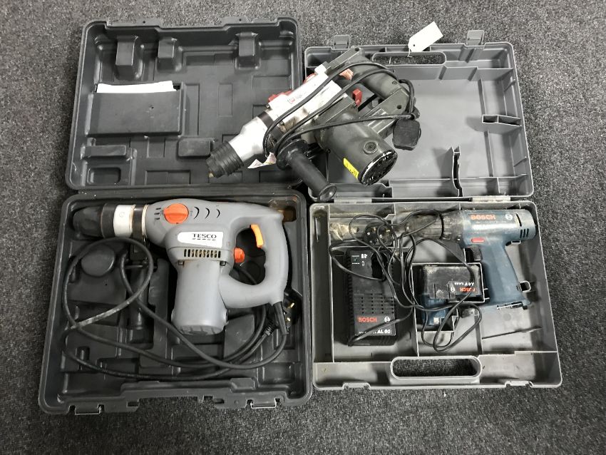 A cased Bosch 9.6V electric drill together with two hammer drills
