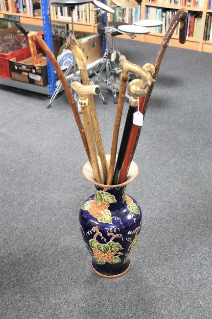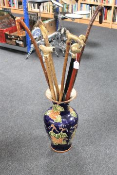 A china vase containing various canes and walking sticks