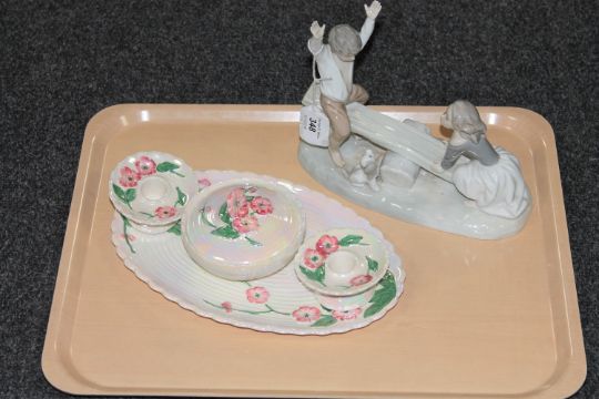 A Spanish figure of a girl and boy on seesaw, together with a four piece Maling trinket set