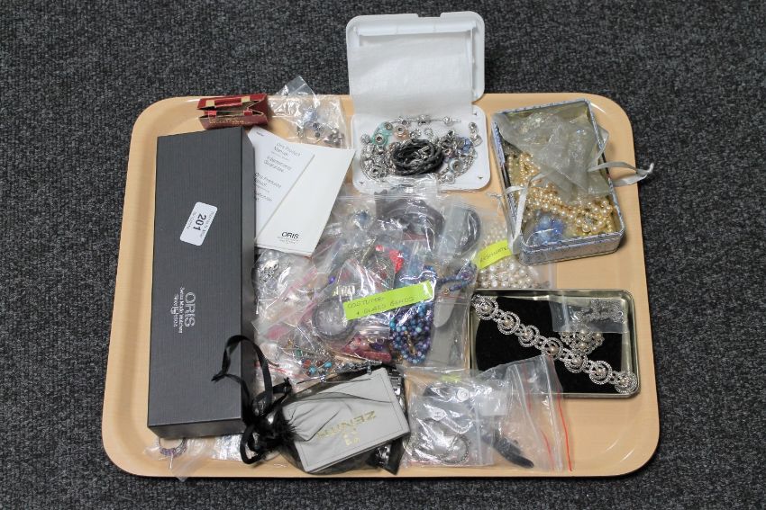 A tray of jewellery including examples in silver, an Oris wrist watch, Marcasite jewellery, Pandora charms and bracelet etc.