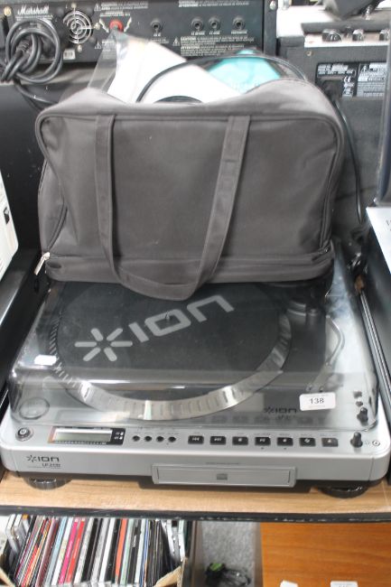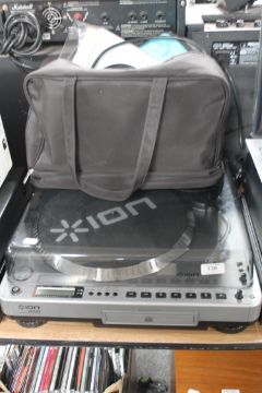 An Ion USB turntable with CD recorder, together with a bag containing headphones etc