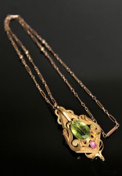 An superb quality antique 15ct gold peridot and ruby pendant with chain