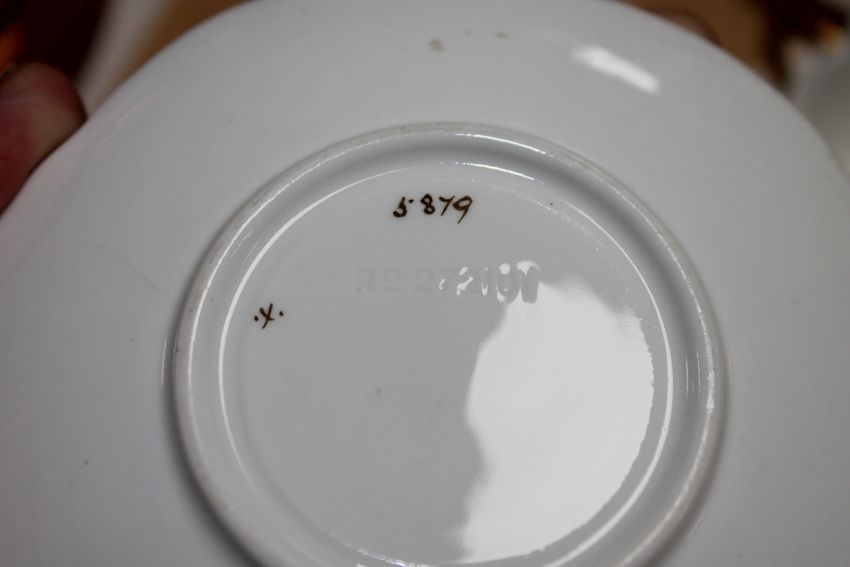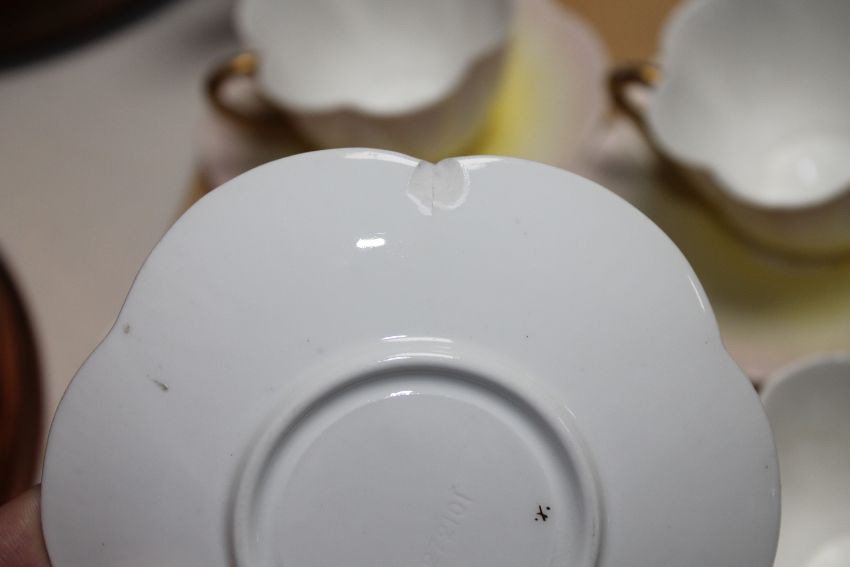One saucer with a fine hairline crack running around the underside (pretty much invisible from the top). Another with a chip to the underside, a little smaller than a fingernail. Otherwise good condition throughout.