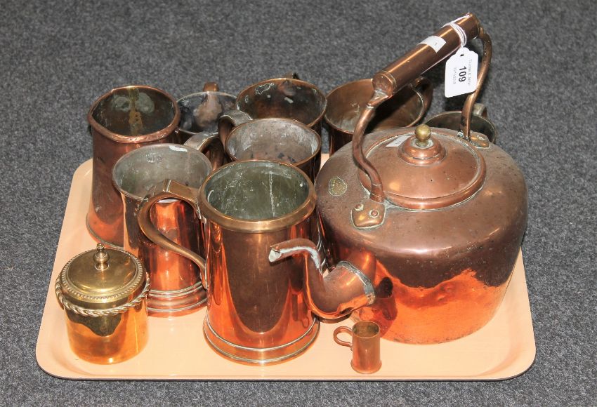 A tray of Victorian copper kettle, various copper tankards and a lidded brass candle pot