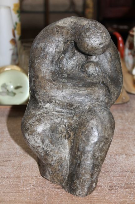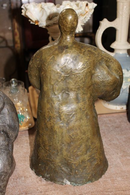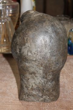 37cm high and 23cm high respectively. The smaller one appears to be carved and polished stone. The larger is a hollow cast of fibrous clay, with a metal covering (copper or bronze?).