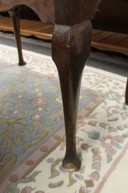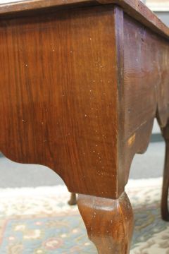 In unrestored condition. Lozenge shaped veneer to centre of top a later replacement. Veneer lifting in other areas. Top needs re-polishing. Back left-leg with section missing to foot. Signs of historic woodworm near the back. Handles probably original but appear to have been taken off at some point.