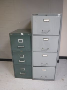 A metal filing cabinet with key and a three drawer filing cabinet
