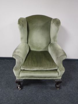 A mahogany wing back armchair in green dralon on claw and ball feet