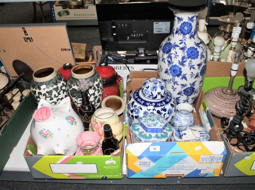 Two boxes of Oriental pattern blue and white china, Maling lustre ware etc