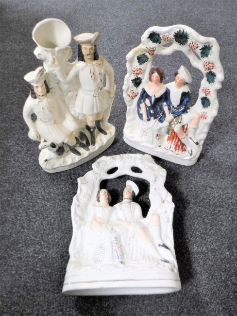 A pair of Staffordshire flat backed figures - Figures seated on a bench together with a Staffordshire spill vase