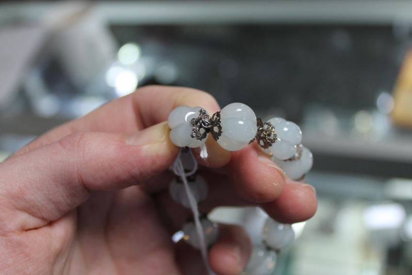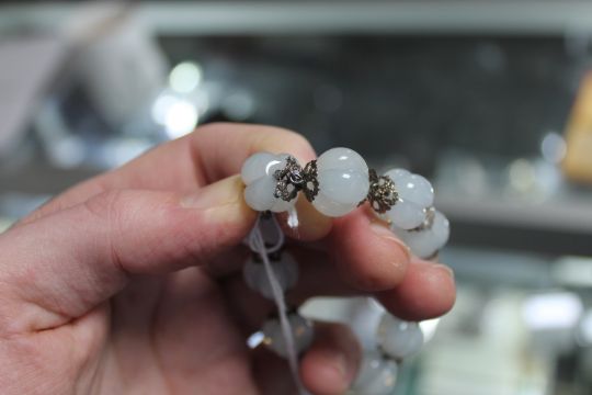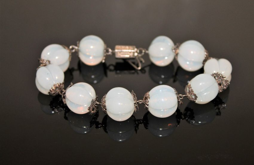 19cm long. One of the moonstones next to the clasp is missing one of its small silver dividers. A couple of the other silver dividers have minor losses. Lacks safety chain.