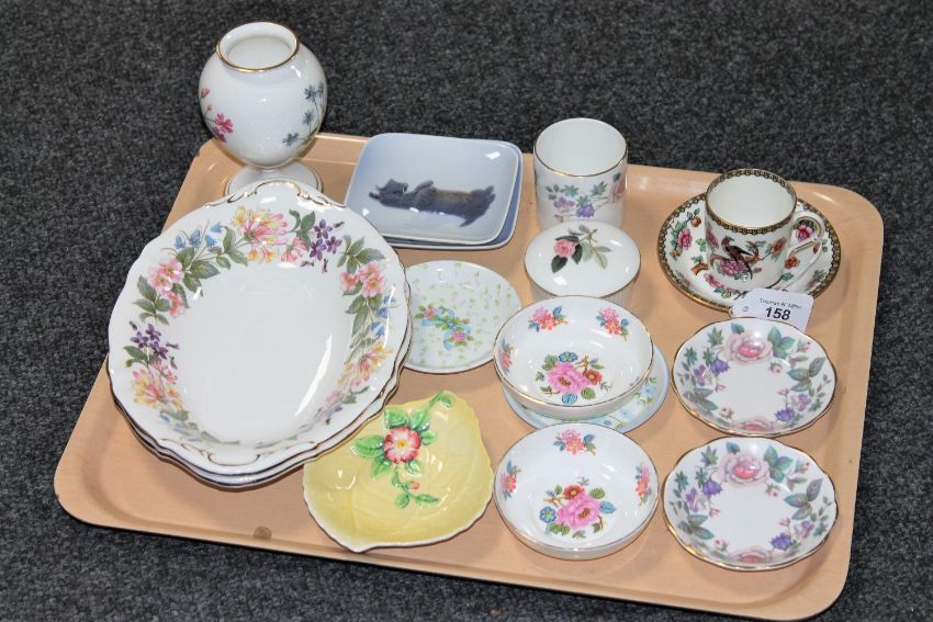 A tray of two Royal Copenhagen shallow dishes depicting dogs, other various china including Wedgwood Hathaway Rose, Cauldon, Royal Grafton etc