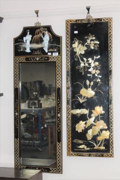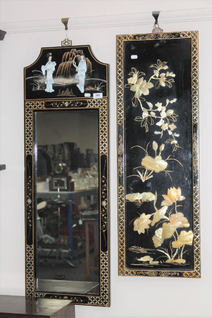 A Japanese lacquered framed hall mirror and a wall panel