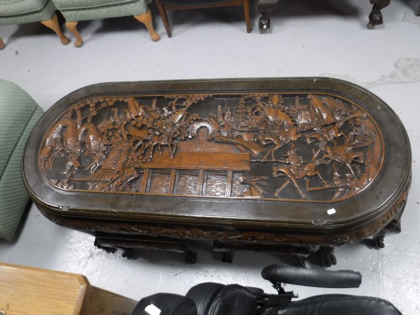 A large, oval Eastern carved coffee table with a glass top fitted with six tables beneath