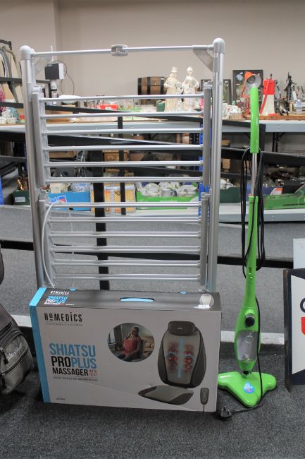 A boxed homemedics shiatsu pro plus massage cushion together with an electric clothes airer and steam mop