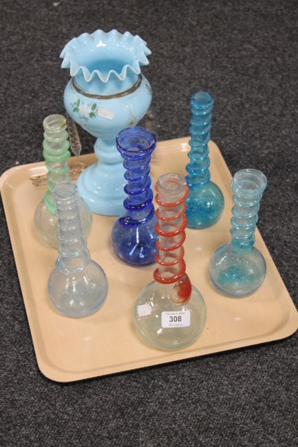 A tray of antique spiral twist glass bottles together with a part Victorian lustre