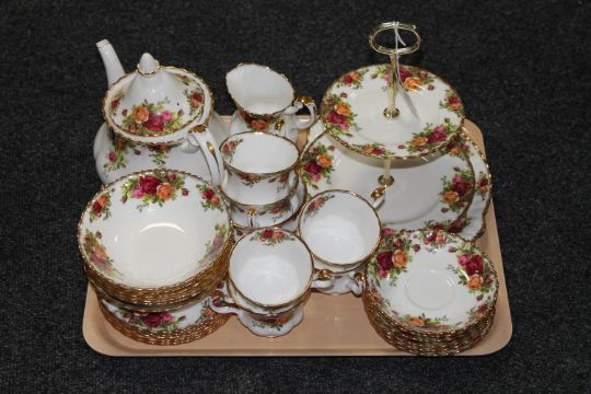 A tray of Royal Albert Old Country roses tea china including cake stand, teapot etc