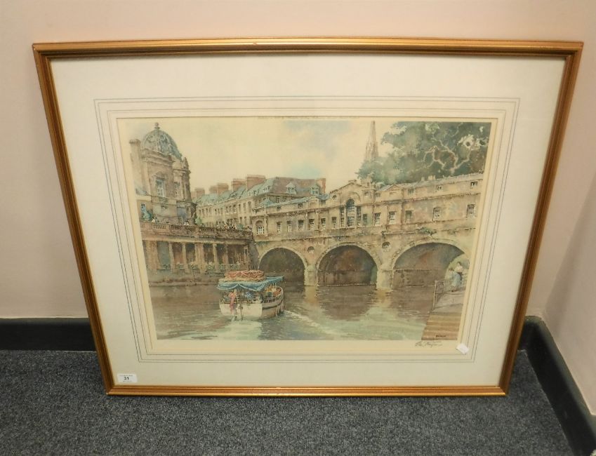 After Eric Richard Sturgeon : Pulteney Bridge, Bath, reproduction in colours, signed in pencil, with the blindstamp of The Fine Art Trade Guild, 44 cm x 57 cm, framed.
