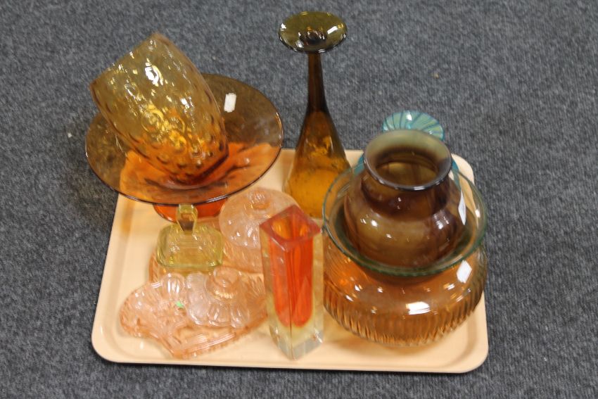 A tray of Mdina glass vase, amber glass bowl, dressing table glass etc