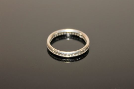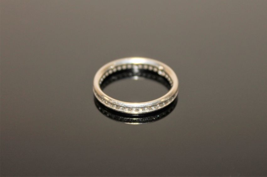 The ring is in good condition. The inner shank is stamped '950' for platinum. Weight 3.2g. The ring is channel set with approximately 40 brilliant cut diamonds. The total diamond weight is estimated at 0.35 carat. Approximate clarity SI1/SI2. Approximate colour I/J.