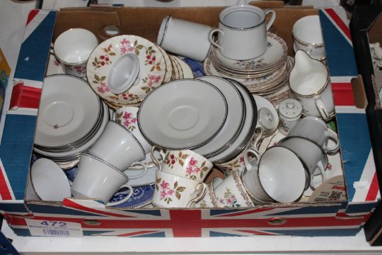 Three boxes of tea china, Ringtons tins, Japanese dinner ware, figured ornaments, Maling pottery etc