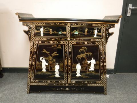 A Japanese lacquered two drawer side table with mother of pearl figures