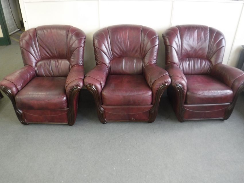 Three burgundy leather armchairs