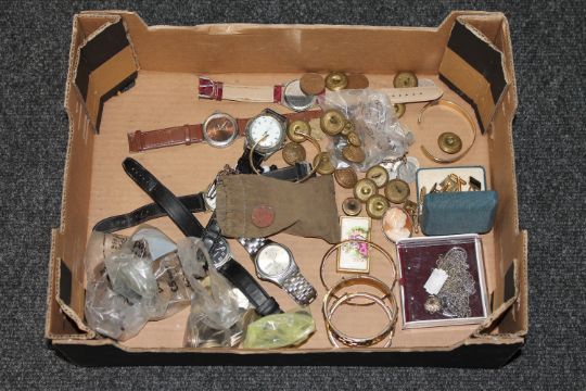 A box containing costume jewellery and wristwatches, silver cameo brooch, pre-decimal coins etc