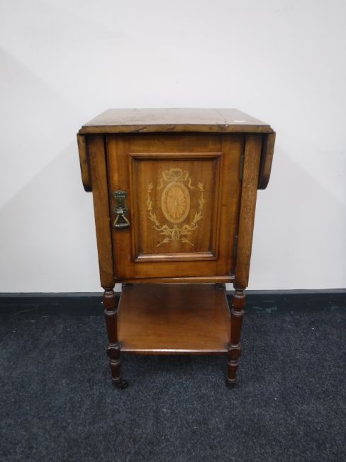 A Victorian inlaid mahogany flap sided bedside cabinet